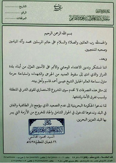 • بيان استنكار سماحة آية الله السيد محمود الهاشمي(مدظله) لتجاوز النظام البحريني على حرمة منزل الشيخ عيسى قاسم